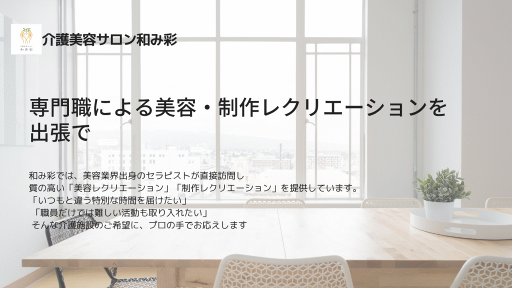 - 美容レク:ハンドマッサージ、福祉ネイル、季節のスキンケア体験など